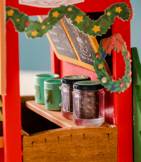A karácsonyi díszek, mint a zöld girland és a koszorú, vidámabbá és barátságosabbá varázsolják az üzletet, tökéletesen kiegészítve a stand piros homlokzatát.